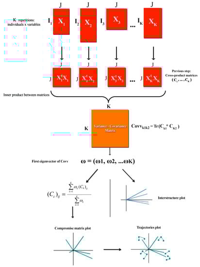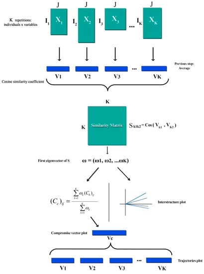 The STATIS methods’ primary objective is to analyze a sequence of matrices and build an average matrix of them [,]. Therefore, these methods can be considered as a generalization of a sequence of dimensionality reductions for different data matrices. All STATIS methods comprise three stages: interstructure, compromise and intrastructure (also known as trajectories).