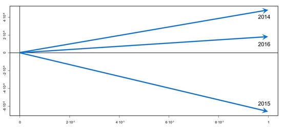 The first thing we can plot is interstructure. As it has been said in a previous section, this interstructure graphic can be plotted if we calculate the first two eigenvectors of the similarity matrix S, and it can be useful in order to explain the relations between the vectors with the averages for all the rows from every matrix in the sequence. In our case, as the different matrices of the data sequence have the information for each year of study of the answers of the students (by rows) to the CHAEA test items (by columns), that is, their behavior about their learning styles, each one of these vectors has the information of the average values for each item during the corresponding year (2014, 2015 and 2016, respectively).