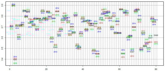 If we focus on item EA37, which belongs to group 2 (Table 1). In that case, the average year has a value of the ratio of affirmative answers between 0.5 and 0.6 (near 0.57), but we can see an evolution along the years: during 2014, the ratio was similar to the average; then, during 2015 the ratio fell until a value near 0.53; and finally, during 2016 the ratio grew up until a much higher value even above 0.6; so, the main conclusion is that EA37 varies a lot along the years: much fewer ‘yes’ answers were given during 2015 than during 2014, and much more ‘yes’ answers were given during 2016.