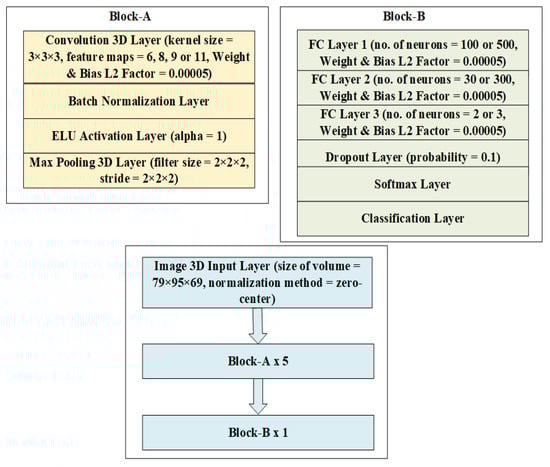 In the architecture given in Figure 1, there is an input layer accepting a volume of size  with zero-center normalization applied to it that works by subtracting the mean and dividing it with the standard deviation to center the data volume on the origin. After that, a block named Block-A is repeated 5 times, and this block is made up of a 3D convolutional layer with a kernel of size 3 in all dimensions. A variable number of feature maps for the extraction of features with a weight and bias L2 factor of 0.00005 is applied to mitigate the impact of overfitting. After the convolutional layer, there is a batch normalization layer, the purpose of which is to normalize the incoming batches through division by standard deviation and subtracting the means, which helps in making the training process faster. After this layer, there is an exponential linear unit (ELU) activation layer with an α value of 1, the purpose of which is to introduce nonlinearity to the output of a neuron. Mathematically,