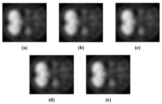 Filtered images used for simulations in our study for binary and multiclass classification of AD: (a) reference image belonging to AD class without filtering; (b) box-filtered image belonging to AD class with SSIM = 0.9921; (c) modified Gaussian-filtered image belonging to AD class with SSIM = 0.9971; (d) Gaussian-filtered image belonging to AD class with SSIM = 0.9992; (e) median-filtered image belonging to AD class with SSIM = 0.9952.