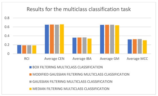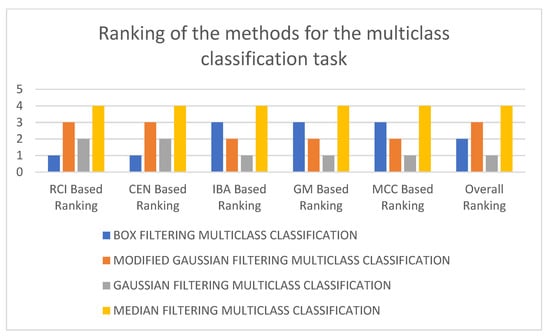 In Table 2, it can be seen that the 3D-CNN architecture trained on Gaussian-filtered data performed the best for the multiclass classification task. It is followed by box filtering and modified Gaussian-filtering-based approaches. The worst-performing architecture utilizes median-filtered data. As a matter of fact, considering RCI, average CEN, average IBA, average GM, and average MCC as performance metrics, the worst-performing model is the 3D-CNN architecture trained using median-filtered data. In terms of RCI and average CEN metrics, the best-performing model is the 3D-CNN architecture trained using box-filtered data, while, in terms of average IBA, average GM, and average MCC metrics, the best-performing model is the 3D-CNN architecture trained on Gaussian-filtered data. Figure 3 and Figure 4 display the results and rankings of methods for the multiclass classification task.