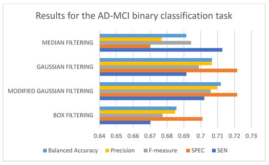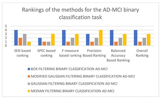 In Table 3, it can be seen that the 3D-CNN architecture trained using modified Gaussian-filtered data performed the best for the AD-MCI binary classification task. It is followed by the 3D-CNN architecture trained using Gaussian-filtered and 3D-CNN architecture trained using median-filtered data. The worst-performing model is the 3D-CNN architecture trained using box-filtered data. It can also be observed that, in terms of the SEN metric, the best-performing model is the 3D-CNN architecture trained on median-filtered data. In terms of SPEC, F-measure, precision, and balanced accuracy, the best-performing model is the 3D-CNN architecture trained on modified Gaussian-filtered data. Figure 5 and Figure 6 display the results and rankings of methods for the AD-MCI binary classification task.
