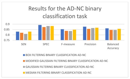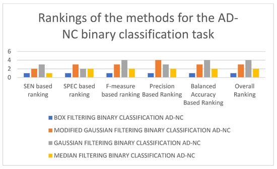 In Table 4, it can be seen that the 3D-CNN architecture trained using box-filtered data performed the best for the AD-NC binary classification task. It is followed by the 3D-CNN architectures trained on median-filtered and modified Gaussian-filtered data. The worst-performing model is the 3D-CNN architecture trained on Gaussian-filtered data. In terms of SEN, F-measure, and balanced accuracy, the worst-performing model is the 3D-CNN architecture trained on Gaussian-filtered data. In terms of SPEC and precision, the worst-performing model is the 3D-CNN architecture trained using modified Gaussian-filtered data. Figure 7 and Figure 8 display the results and rankings of methods for the AD-NC binary classification task.