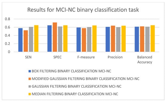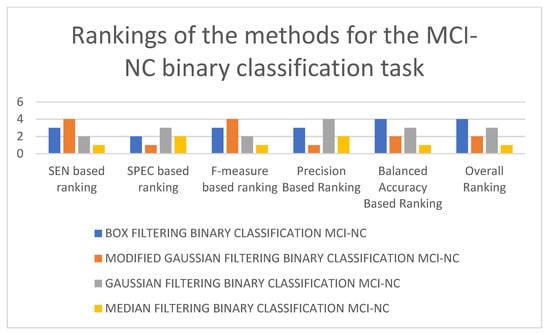 In Table 5, it can be seen that the best-performing model is the 3D-CNN architecture trained on median-filtered data for the NC-MCI binary classification task. It is followed by the 3D-CNN architectures trained on modified Gaussian-filtered and Gaussian-filtered data. The 3D-CNN architecture trained using box-filtered data performed the worst. In terms of balanced accuracy, F-measure, and SEN, the best-performing model is the 3D-CNN architecture trained on median-filtered data, while in terms of SPEC and precision, the best-performing model is the 3D-CNN architecture trained on modified Gaussian-filtered data. The worst-performing model, in terms of SEN and F-measure, is the 3D-CNN architecture trained on modified Gaussian-filtered data. Figure 9 and Figure 10 display the results and rankings of methods for the MCI-NC binary classification task.