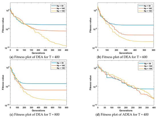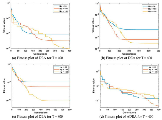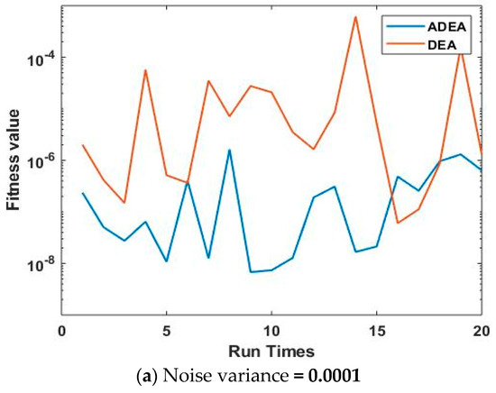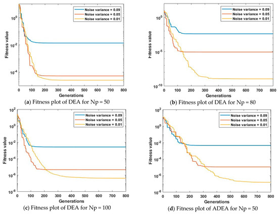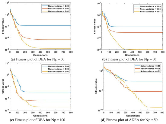 The statistical investigations of DEA and ADEA for various numbers of runs, with different noise variances, fixed population sizes, and constant generation sizes are shown in Figure 13. It is witnessed from Figure 13a–c that, for all values of noise variances, ADEA is more convergent than DEA, and the optimal fitness achieved by ADEA is much better than that of DEA for all noise variances. It is also noticed that the performance of both DEA and ADEA only slightly degrades by increasing the noise level.