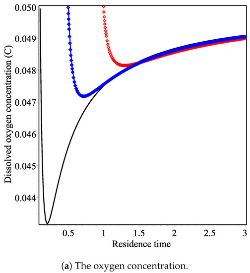 Figure 1a shows that the oxygen concentration decreases as a function of residence time to minimum value, called the minimum residence time. After this minimum value, the oxygen concentration increases as the value of the residence time increases. Note that the minimum residence time for and are 1.30025 and 0.201052, respectively. Thus, the value of parameter must be taken lower to minimise the oxygen concentration.