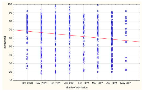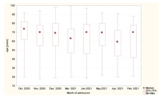 A statistically significant difference was found in month of admission and age of the patients (r = −0.1488; p = 0.00003, Figure 2). At the beginning of the third wave, more older patients were admitted to ED (74 (66–82) vs. 70 (42–78) years old).