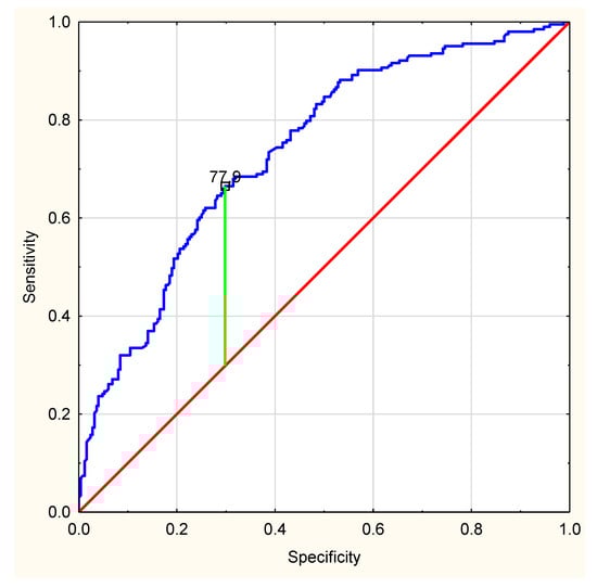 The ROC curve for CRP level shows that there is a cut-off point of 77.9 mg/L. Patients with CRP above this level are more likely to be admitted than discharged (AUC 0.738, p < 0.0001) (Figure 3).
