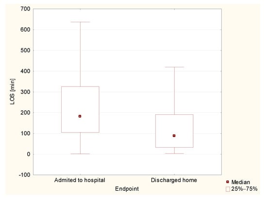 The median LOS in the ED was 134 min (47–251). The shortest length of stay was 2 min, whereas the longest lasted 3063 min. This parameter varied between groups. The lowest median LOS was in the group of those discharged home (89 min (10–1470). This was followed by those admitted to the intensive care unit (140 min (37–532)), followed by those admitted to non-ICU ward (183 min (362–3063)). The highest median length of stay concerned deceased patients—293 min 965–867). In the analysis of statistical significance of differences in LOS, the groups of deceased patients and patients admitted to the intensive care unit were excluded due to a very small size of these groups, as in previous statistics. The analysis showed statistically significant differences in length of stay between the groups of patients discharged home and those admitted to the hospital (p < 0.0001, Figure 4).