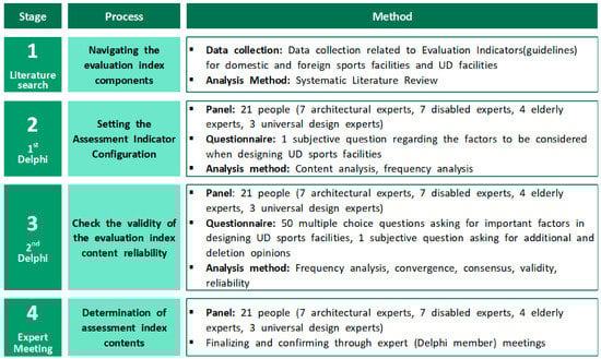 Therefore, we established the scope of UD elements and a method of deriving evaluation indicators through a literature review, extracted the factors to be considered for UD-applied sports facilities through two Delphi surveys, and determined the elements of the evaluation indicators through expert meetings.