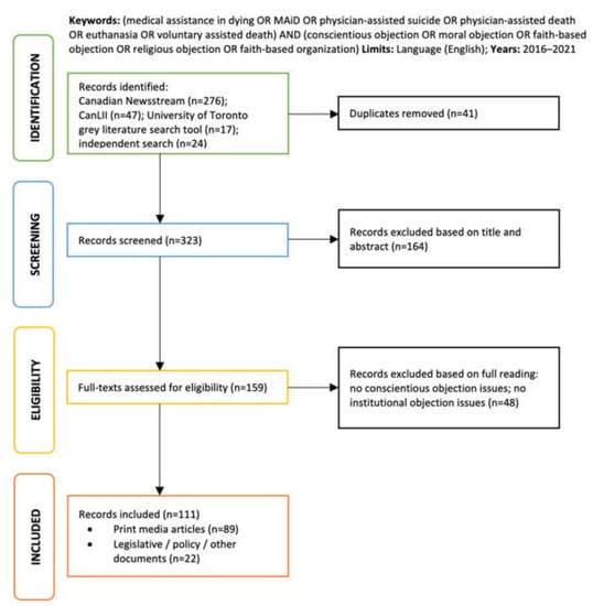 We performed an exhaustive electronic search of 2 large databases, Canadian Newsstream and CanLII. Canadian Newsstream focuses exclusively on Canadian print media and includes over 350 news sources (i.e., national, provincial, and regional newspapers and magazines) in its database. CanLII is a database provided by the Canadian Legal Information Institute, where the full text of all court judgments, tribunal decisions, statutes, and policy regulations from all Canadian jurisdictions are available. It also provides a subsidiary database, CanLII Connects, where case commentaries, summaries, and opinion pieces from lawyers, scholars, and other legal experts can be found. A supplementary search, using a search tool developed by the University of Toronto Library, was performed to collect government documents (reports, policy papers, etc.). This was augmented by an independent scan of healthcare organization websites to capture relevant information (press releases, position statements) that would be otherwise difficult to locate in traditional databases. Our search terms included “medical assistance in dying” (and related terms, i.e., “MAiD”, “euthanasia”, “physician-assisted death”, “physician-assisted suicide”) AND “conscientious objection” (and related terms, e.g., “moral objection”, “faith-based objection”, “religious objection”, “faith-based organization”). Articles from non-Canadian jurisdictions were excluded to focus our analysis to the Canadian context. The complete search and elimination sequence is available in Figure 1.