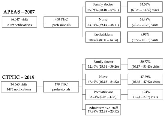 Flowchart of the number of visits and notifications and the distribution of PHC professionals’ participation in the APEAS–2007 and CTPHC–2019 studies. PHC; Primary Healthcare.