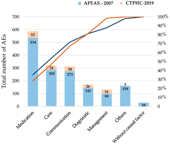 In the comparison of causal factors associated with AE notifications, both studies identified medication as the most prevalent causal factor. Although the absolute numbers of AEs were different between both studies, their distribution depending on the causal factors was similar. However, in the CTPHC–2019 study, there were higher numbers of AEs related to healthcare (25.72% vs. 32.38%; p < 0.001), communication (24.64% vs. 36.19%; p < 0.001), diagnosis (13.09% vs. 24.76%; p < 0.001), and management (8.94% vs. 29.52%; p < 0.001) compared to the APEAS–2007 study (Figure 2).