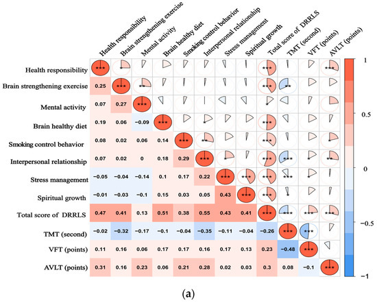 The Spearman correlation analysis of DRRLS scores and neurocognitive scores in SCD and MCI groups showed that the total score of DRRLS was negatively correlated with TMT (r = −0.259, −0.418, p < 0.05) and positively correlated with VFT (r = 0.235, 0.248, p < 0.05) and AVLT (r = 0.295, 0.398, p < 0.01). Among the DRRLS subfields, brain-strengthening exercise, brain-healthy diet, and interpersonal relationship were negatively correlated with TMT (r = −0.315–(−0.389), p < 0.01), while health responsibility, mental activity, smoking control behavior, interpersonal relationship, and stress management were positively correlated with AVLT (r = 0.209–0.377, p < 0.05), as shown in Table 3 and Figure 1. The correlation results have been adjusted with a correction for multiple comparisons.