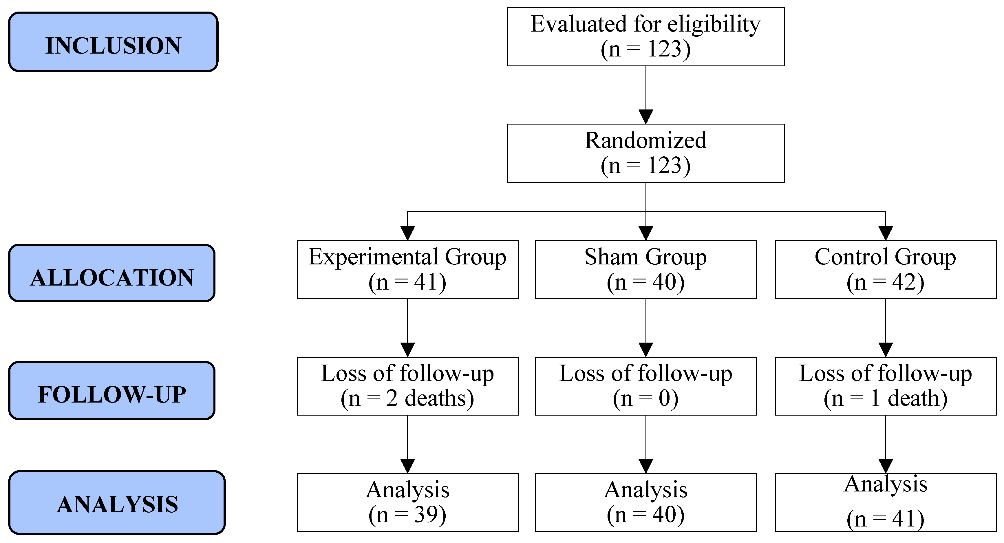 | Variable | Experimental Group (n = 41) | Group Sham (n = 40) | Control Group (n = 42) | p | |||