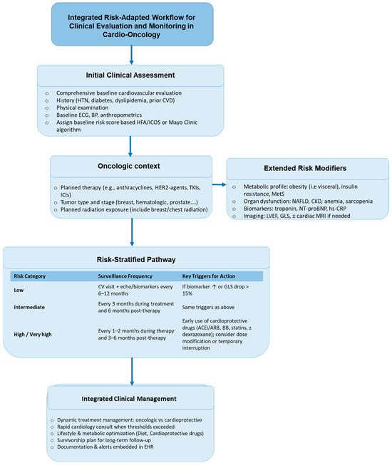 Integrated risk-adapted workflow for clinical evaluation and monitoring in cardio-oncology. The diagram summarizes a step-wise, clinically actionable pathway that integrates baseline cardiovascular assessment, oncologic treatment context, and extended risk modifiers (metabolic, organ-related, and imaging/biomarker data) to guide risk stratification and surveillance. Patients are categorized as low, intermediate, or high/very-high risk, which determines the recommended frequency of cardio-oncology visits and echocardiographic/biomarker monitoring. Specific thresholds—such as a ≥15% reduction in GLS, a ≥10-point fall in LVEF to <50%, or persistent elevation of troponin/NT-proBNP—trigger early cardioprotective interventions (ACE inhibitors/ARBs, β-blockers, statins, ± dexrazoxane, and, as indicated, SGLT2 inhibitors, sacubitril/valsartan, GLP-1 receptor agonists, or PCSK9 inhibitors) and multidisciplinary re-evaluation of oncologic therapy. The workflow emphasizes dynamic adjustment of treatment, early cardiology involvement, optimization of metabolic health, and long-term survivorship planning, supported by structured documentation and electronic health-record alerts.