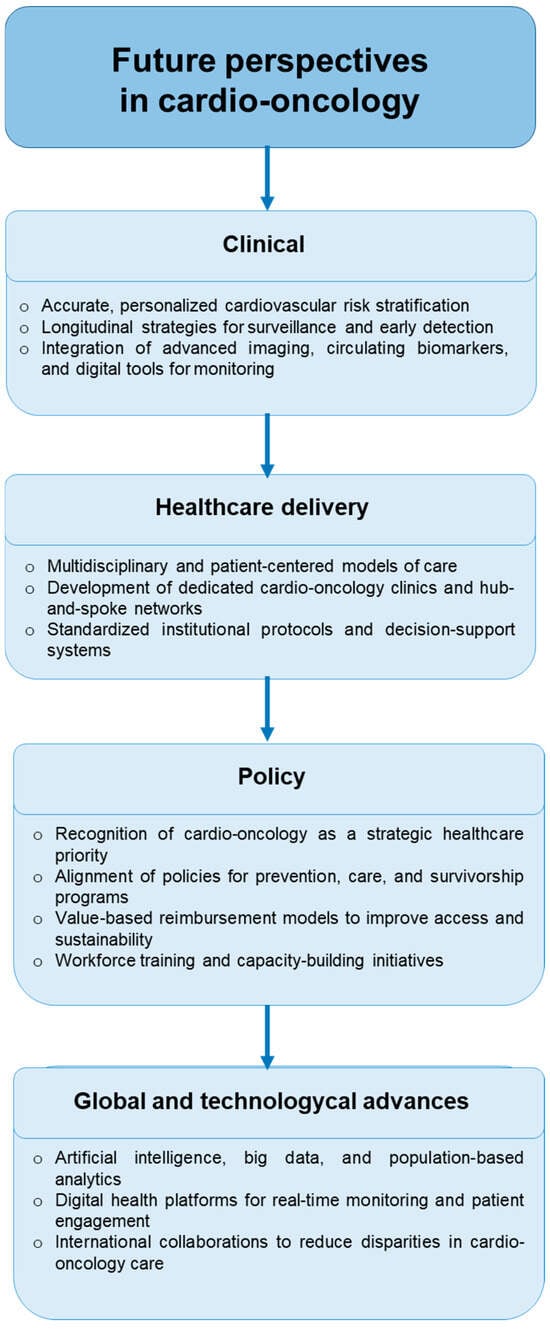 Future perspectives in cardio-oncology highlight four key domains: clinical innovation through personalized risk stratification and advanced monitoring tools; healthcare delivery via multidisciplinary care models and standardized protocols; policy initiatives that prioritize alignment, reimbursement, and workforce training; and global and technological advances, including artificial intelligence, digital health platforms, and international collaborations to reduce disparities in care.