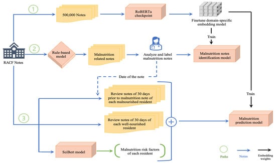 Figure 1 depicts our NLP pipeline. It consists of three pathways: Path 1, pre-training a domain-specific LLM; Path 2, fine-tuning a malnutrition note identification model; Path 3, fine-tuning a malnutrition prediction model.