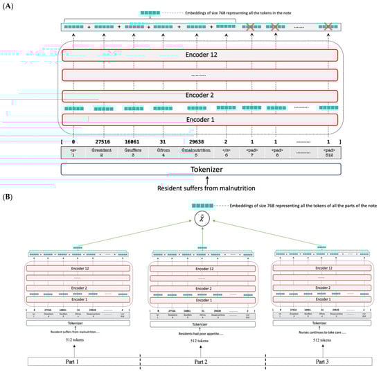 Methods developed for processing long notes with more than 512 tokens. (A) Example of a nursing note with sequence length less than 512 tokens; (B) Example of a nursing note with sequence length of 1536 tokens. This note is truncated into 3 parts each with a sequence of 512 tokens.