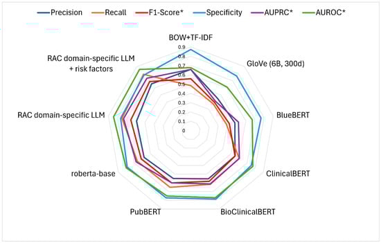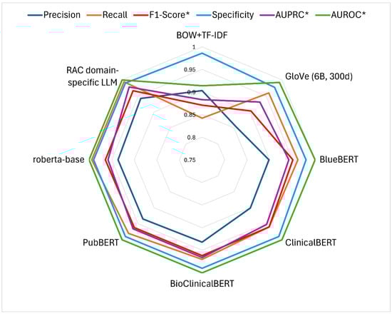 In accordance with the previous reports [,,], LLMs significantly outperformed other comparative models with our RAC domain-specific LLM achieving an F1-score of 0.966, while GloVe and BOW had an F1-score of 0.903 and 0.871, respectively. However, all LLMs yielded comparable performance in this task. We argue that this can be attributed to the notable difference in notes between the positively labelled and negatively labelled instances in the dataset compared to those in the second task.