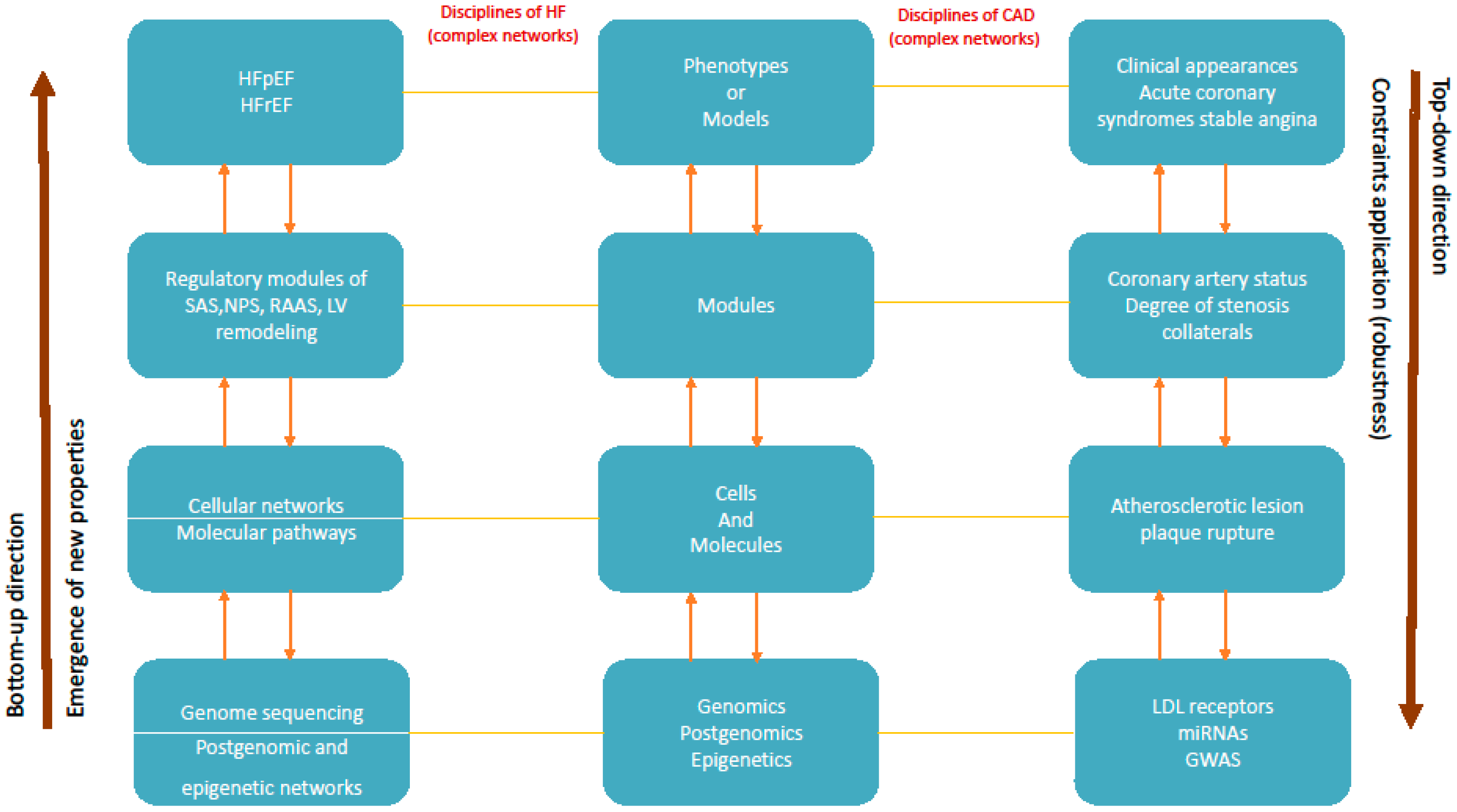 Chronic complex diseases are multifarious in origin with a variety of biologically culpable components and environmental factors being implicated. Complex diseases are clinically progressive through multiple interactions between the involved components and environmental parameters. Heart failure (HF) and coronary artery disease (CAD) are chronic complex cardiac diseases promoted by the integration of various genetic, molecular and environmental factors. HF and CAD are complex adaptive systems and should be approached with the holistic methodology of systems biology. Technological progress of computational methodologies has motivated scientists and clinical practitioners to address complex pathologies. The advances of systems biology in the field of cardiovascular systems and the build-up of vast numbers of biological data have increased accurate analysis and integration of accumulated data [1]. The gradual build up of new scientific knowledge in the field of cardiology together with the advances in medical technology increased the chances to acquire further related information from complex medical datasets. Large numbers of computational data can be uploaded and maintained on vast remote servers (cloud computing). With the valuable accumulation of data it is possible to retrieve relevant medical information when it is needed and integrate this across data groups. Systems biology is the science that deals with integration of biological components producing ”system” of interacting molecules, networks, modules and phenotypes. Wolkenhauer [2] defines systems biology as “an approach to understanding complex, non-linear spatio-temporal phenomena, across multiple levels of structural and functional organization”. The principal objective of systems biology is to comprehend the way that interactive biological components construct functional networks at the level of organism and disease [3]. In addition, systems biology is concerned with the “emergent” functional properties derived from the interplay between genes, molecules, cells and tissues (upward biological direction), and with the restrictions imposed by “constraints” (downward biological direction) which establish biological robustness. After the advances made in molecular understanding of complex diseases it is inevitable for a shift of perspective in medical thinking from genomics to clinical phenotypes. Therefore, the interdisciplinary application of systems biology concept is extended to the level of clinical medicine. In explaining complex diseases new expressions are emerging based on systems biology phraseology like “systems medicine” which stands for the medical application of systems biology and “in silico medicine” that represents the “in silico computational integration of patient-specific data” [4].