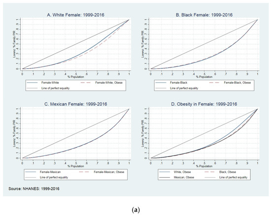 There are also strengths to this study. To our knowledge, it is the first study to examine the relationship between income inequality and obesity between men and women based on their race/ethnicity with a wide range of NHANES data (1999–2016). We used weighted models that make our findings nationally representative estimates, increasing the generalizability of these results. We need to notice that the Lorenz curves are unaffected by the mean of the distribution, and “they cannot be used to rank distributions in terms of social welfare, only in terms of inequality” [32]. Because of NHANES publicly available data, we were not able to control our models for geographical variables such as urban and rural areas and neighborhoods or county level to capture more variances. This is the next step in our study.