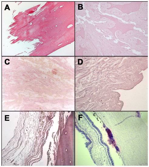 H&E staining: occipital bone from case 1 (A); mandible fragment from case 3 (B); soft tissues surrounding laryngeal fracture from case 4 (C); neck skin from case 5 (D); rib fracture from case 5 (E); retina from case 6 (F).