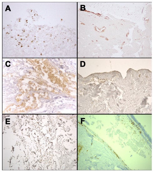 The immunohistochemical investigation was performed in all cases, showing interesting results. Monoclonal antibodies against GPA resulted positive in all analyzed cases, indicating the presence of RBC and demonstrating the vitality at the moment of the lesion. Indeed, the results in the control case were negative.