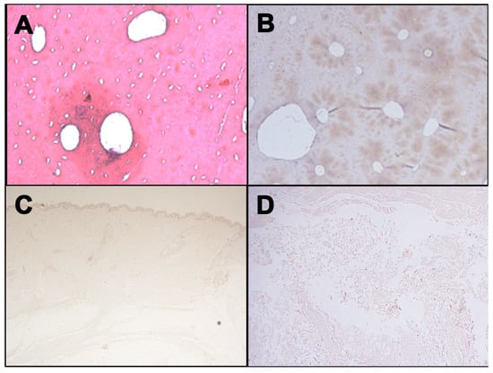 Negative immunohistochemical staining with anti-human GPA antibody for different tissues: Femur ((A), H&E; (B), immunostaining with anti-human GPA antibody); (C) Skin; (D) Soft tissues surrounding laryngeal area.