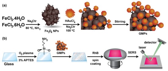 (a) A schematic of the synthesis of Fe3O4 NPs and GMPs. (b) The procedures for SERS substrate preparation and measurement.
