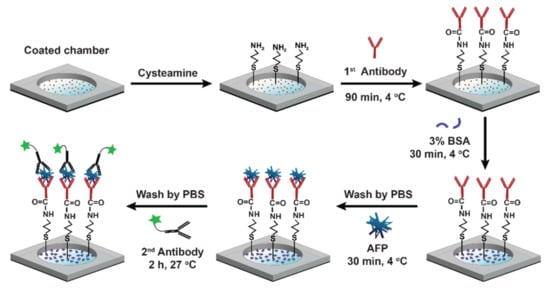 For the MEF-based AFP detection, we immobilized the GMPs on the surface of the chamber bottom, as described above. A 10 mM cysteamine solution was added to the chamber, and it was subsequently kept at room temperature for 2 h to develop amine groups on the surfaces of the GMPs. Then, the primary antibodies (0.1 μg/mL, 100 μL) were incubated on the amine-modified surface for 90 min at 4 °C. The surface was washed with PBS to remove the unbound primary antibodies. Then, 100 μL of BSA solution (0.1 wt%) was added for 30 min to eliminate nonspecific binding sites. After additional PBS washing, 100 μL of AFP with varying concentrations was incubated on the surface of the chamber for 30 min. Finally, the secondary antibodies conjugated with Alexa 488 (100 μL, 2 μg/mL) were added to the chamber surface, keeping them for 1 h at 27 °C. The surface was washed again with PBS, making it ready for MEF measurement. A schematic of the AFP immunosensor fabrication is depicted in Figure 2.