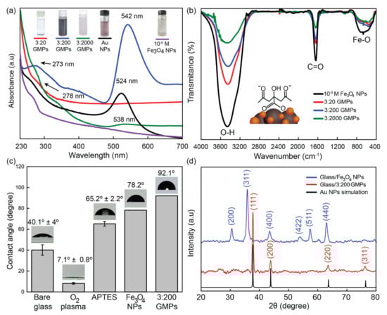(a) The UV-Vis spectra of 10−5 M Fe3O4 NPs and GMPs with various ingredient ratios compared to Au NPs, (Adapted with permission from Ref. []. Copyright 2020, RSC). (b) The FTIR spectra of 10−5 M Fe3O4 NPs and GMPs with different ingredient ratios. (c) The water contact angle, with images of the interface between a water drop and the modified surface at each step. (d) The XRD pattern of the Fe3O4 NPs and the 3:200 GMPs on glass compared to the Au NP simulation (JCPDS file: 04-0784).