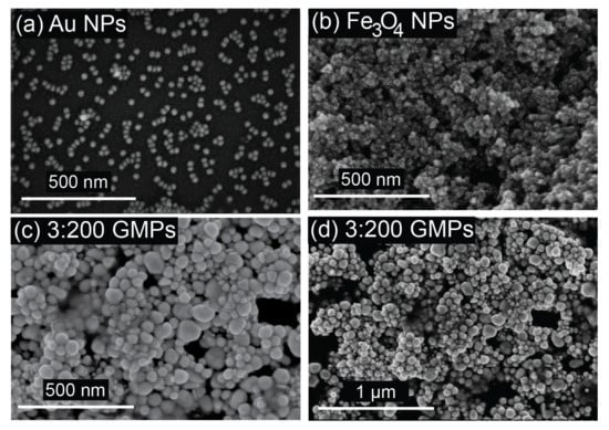 Field-emission scanning electron microscopy (FESEM) was used to determine the morphology of the samples. Figure 4 shows FESEM images of the coated Au NPs, Fe3O4 NPs, and GMPs on glass substrates (nanoparticle coating by 16 h of immersion in the respective solutions). As shown in Figure 4a,b, the size of the Au NPs and the Fe3O4 NPs was about 30 nm, while the larger particles represented the assembly structure of GMPs (from 60 to 100 nm), as shown in Figure 4c,d. The magnetism of the Fe3O4 NPs could account for the aggregated nature of the nanoparticles. In addition, the particle size shown in Figure 4 was in an agreement with the crystalline size estimated by the XRD data. Various sizes of GMPs could be explained by the rapid change in the reducing process of the synthesis or by the aggregation of the GMPs []. The relatively uniform morphology of the GMPs could make them serve as a SERS substrate that produces stable and reproducible signals [].