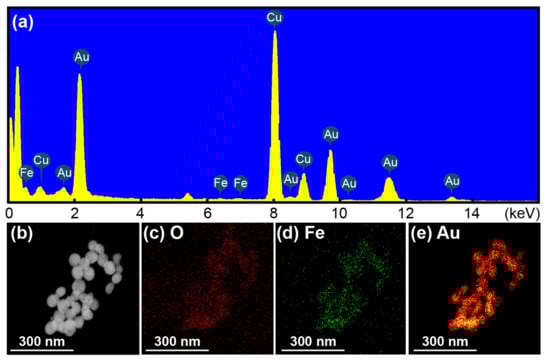 Figure 5a shows the energy-dispersive X-ray (EDX) spectra of the fabricated GMPs with EDX mapping of the O, Fe, and Au elements. The appearance of Cu was due to the use of the copper grid and the carbon-coated copper grid. It was also seen that the Au element was found in a much larger portion than the Fe element. The mass percentage of Fe was 1.45%, whereas the Au is 98.55%, indicating the constituent molar ratio is approximately 3:200. The absence of oxygen in the EDX spectra could be explained by the limited EDX resolution of 0.1 wt% of bulk material for a given oxygen portion less than 0.01 wt% [].