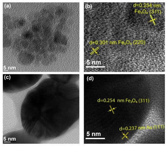 High-resolution transmission electron microscopy (HRTEM) was performed to check the morphology and the element layer, as shown in Figure 6. Obviously, both the Au NPs and the GMPs were highly crystalline and were described as having sphere-like morphology. Figure 6a,b present the HRTEM images, illustrating the crystallinity of the Fe3O4 NPs. The d spacing of 0.254 nm and 0.301 nm corresponded to the (311) and (220) planes of the crystalline Fe3O4, respectively. These properties matched the FCC structure [,]. Figure 6c presents an HRTEM image of the GMPs, where the d spacing was estimated from a chosen GNP, as shown in Figure 6d. These HRTEM images of GMPs reveal their detailed structures with the crystalline deposition of Au elements on the surface of the Fe3O4. As seen in Figure 6d, the (311) plane of the highly crystalline Fe3O4 was observed with a d spacing of 0.254 nm. Another d spacing of 0.237 nm was measured in the shell layer, which was consistent with the d value of the Au (111) planes []. From the images, we could estimate the diameter of GNP (3:200 ratio) to be 80 nm, assuming an approximately spherical nanocomposite shape. The GNPs were assembled together due to their magnetic properties. The weak contrast of the images across the GMP boundaries may have been due to the surfactant-induced thin coating. The HRTEM results were in good agreement with the XRD characterization. Both results supported the successful fabrication of the GMP structure.
