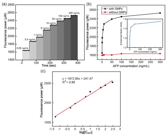 (a) The fluorescence power measurement while increasing the AFP concentration (0.05–300 ng/mL) over time. (b) The fluorescence signals obtained with the chamber surface, where the GMPs were coated (black) or not (red), and their corresponding EF values (blue). (c) The linear fitting of the fluorescence power versus the logarithm of the AFP concentration in the range of 0.05–300 ng/mL.