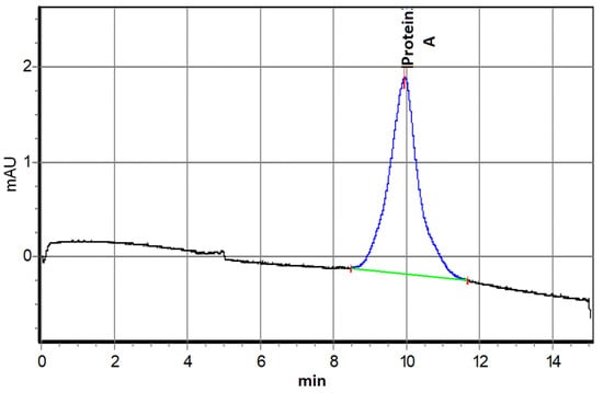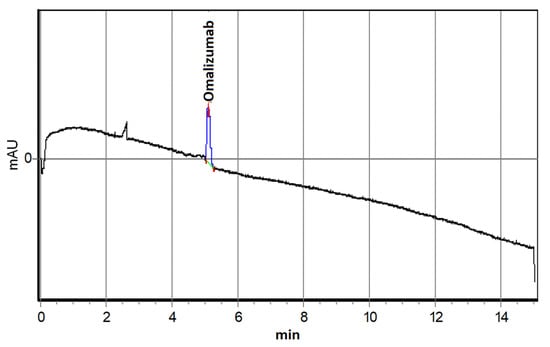 Electropherograms of stock solutions showed a single electrophoretic peak at 4.8 min for omalizumab (Figure 1) and 9.9 min for protein A (Figure 2).