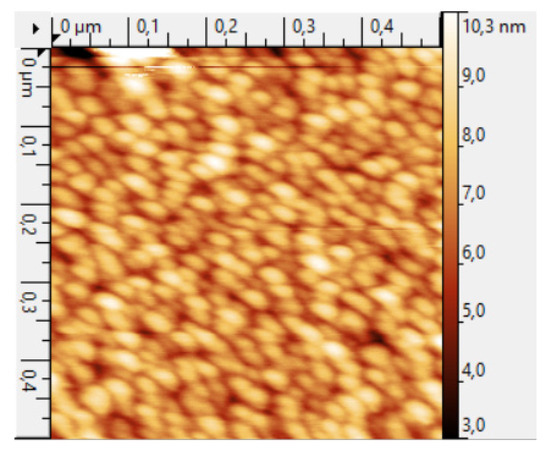 The biosensor was based on a ceramic substrate with NiCr/Ni/Au interdigitated electrodes (Sensor Platform, Tesla Blatna, a.s.). The width of the electrodes and the distance between the electrodes deposited on the substrate were 25 μm. Coating of the ZnO nanorods was performed by a two-stage procedure, consisting of ultrasonic spray pyrolysis of a zinc oxide seed layer and the low-temperature hydrothermal synthesis of nanorods with suppression of nucleation in the bulk solution. This technique allows a selective growth of nanorods to be realized only on the substrate surface. In the first stage, an aqueous solution of 0.05 M zinc acetate (purity ≥ 99%, Vekton, Saint Petersburg, Russia) was used to deposit a ZnO seed film by ultrasonic spray pyrolysis for 5 min. The substrate heating temperature was maintained at +380 °C. A control sample of the ZnO seed layer was formed on the polished side of the silicon substrate. The morphology of the seed layer was studied using atomic force microscopy (Atomic Force Microscope Probe nanolaboratory INTEGRA- TERMA, NT-MDT, Saint Petersburg, Russia) (Figure 3).