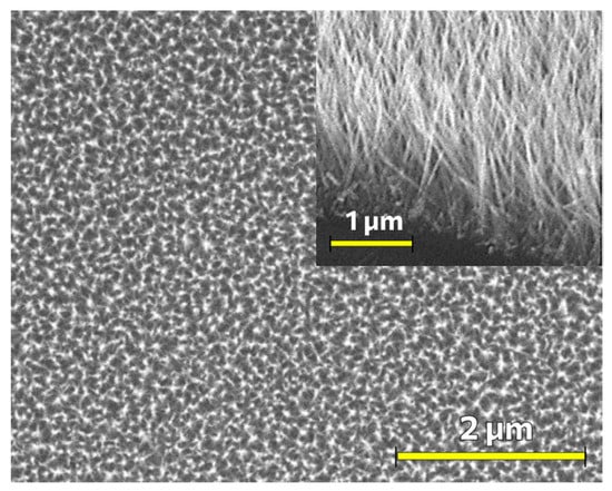 Low-temperature hydrothermal synthesis of ZnO nanorods from a seed layer was carried out using an aqueous solution of zinc nitrate (purity ≥ 98%, Vekton, Saint Petersburg Russia) and hexamethylenetetramine (purity ≥ 98%, Vekton, Saint Petersburg, Russia) with an equimolar concentration of 25 mM, to which ammonia water (purity ≥ 98%, Vekton, Saint Petersburg, Russia) and polyethyleneimine (branched, Mw ~ 800, Sigma-Aldrich, St. Louis, MO, USA) were added to ensure ZnO nucleation in the bulk of the solution. The features of the synthesis of the ZnO nanorods have been described in more detail in []. After synthesis, the ZnO nanorods were annealed at a temperature of +500 °C for 5 min. The results of the scanning electron microscopy of a control sample on a silicon substrate are shown in Figure 4.
