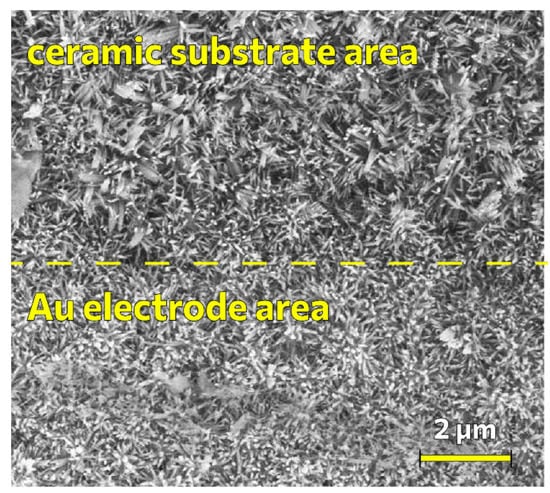 The zinc oxide nanorods were obtained using hydrothermal synthesis on substrates with comb electrodes. The SEM micrograph of the nanorods on the surface of a ceramic substrate with an electrode is shown in Figure 6.