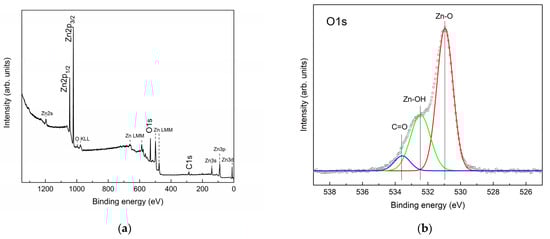 XPS spectra of the surface of ZnO nanorods: (a) survey spectrum of the ZnO surface; (b) spectrum of the core oxygen level, O1s.