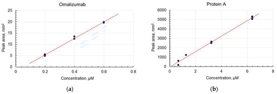 Concentration (µM) dependence of the electrophoretic peak area (mm2): (a) omalizumab, y = 36.434x − 1.9043 (R2 = 0.9982); (b) protein A, y = 821.88x − 53.334 (R2 = 0.9974).