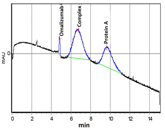 The complex formation of omalizumab and protein A in different molar ratios was studied with capillary electrophoresis. An example electropherogram of a mixture with a ratio of protein A/omalizumab of 1.06 is shown in Figure 9. All electropherograms of mixtures, regardless of the ratio of components, contained three zones, two of which were previously assigned to the initial components, while the third intermediate zone represents the resulting protein–antibody complex.