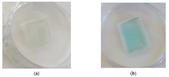 Detection of binding of horseradish peroxidase-conjugated antibodies to the surface of ZnO-coated glasses with bound protein A using TMB treatment: (a) glass with ZnO nanorods without MBS treatment, only silanized: negative control; (b) glass coated with zinc oxide nanorods silanized with MBS treatment.