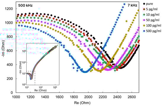 The characteristic frequency range of the supplied alternating signal for the created biochip was approximately from 7 to 500 kHz in the total investigated range of 1 Hz–500 kHz. As can be seen from Figure 11, an increase in the concentration of the target antibody in the sample leads to a change in the impedance spectrum in the Nyquist coordinates of the biochip after it is immersed in the analyzed solution. With an increase in the concentration of the target antibody, omalizumab, a shift in the circular arc in the impedance spectrum is observed.