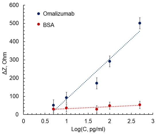 Dependences of the impedance change at a frequency of 10 kHz on the logarithm of the concentration of omalizumab (blue line, y = 220.11x − 134.87, R2 = 0.9421) and BSA (red line, y = 11.096x + 21.432, R2 = 0.6464).