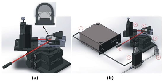 (a) Experimental setup of the SPR sensor for angular interrogation (liquid samples) and (b) SPR scheme for intensity interrogation approach (gaseous samples). The system is integrated by a (1) mass flow controller, (2) metal-sealed pressure flow controller, (3) sample container, (4) silver-coated prism coupled to flow cell, (5) He-Ne laser, (6) photodetector, and (7) stepper rotating stage.