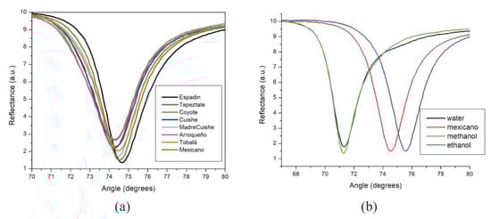 SPR curves at sweep angle of (a) eight mezcal samples and (b) water, methanol, and ethanol solutions measurements with “mexicano” mezcal sample as reference for pointing to the resonant angles region of the samples.