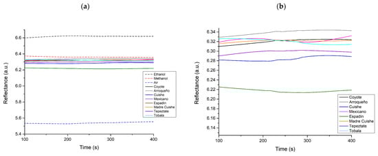 The custom-built gas phase SPR platform is shown in Figure 1b, working under an intensity interrogation approach. The refractive index variations of the gas phase were detected as a change in the reflectance units at a fixed incident angle. This working angle was established at the highest slope of the linear region of the plasmon curve (approaching the critical angle of the minimal intensity of reflected light), which is the region of interest due to its sensitivity to changes in light intensity. The reflectance intensity was monitored as a function of time during the measurement of the mezcal samples. A fluidic system was employed for controlled injection of gas phase analyses, implemented with a mass flow and pressure controller (MKS Instruments, Inc. Andover, MA, USA). The airflow was set at 0.001 sccm and bubbled in one milliliter of the sample (contained in bottles of 10 mL). The flow conditions were maintained to ensure the air carrier flow through the head space to allow the sample to encounter the SPR detection system. Once a measurement concluded, a purge step was performed between mezcal samples, flowing air over the sensor surface for 5 min to dissipate the residues that may have remained in the flow cell. The gas phase of methanol and ethanol solutions was also measured as a reference.